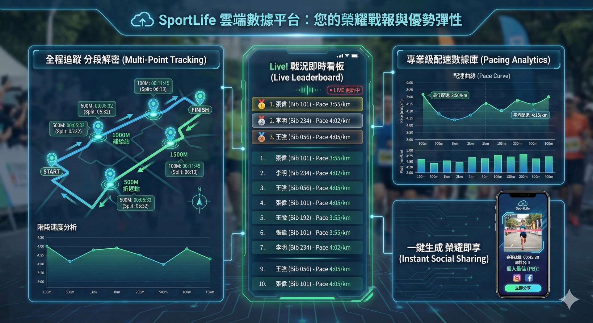 從折返點的堅持到終點的衝刺,SportLife 雲端數據即時記錄平台呈現您的每一個高光時刻。