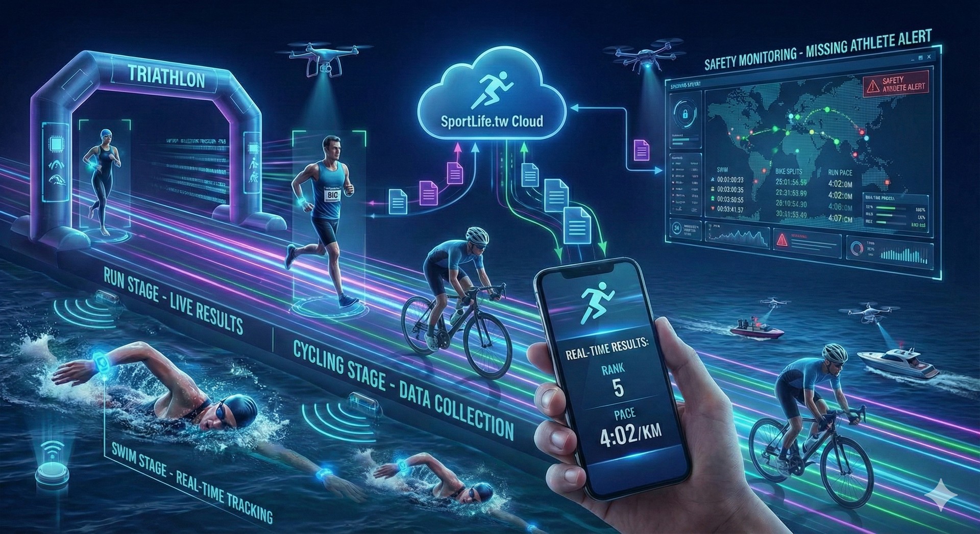 系統後台即時監控「起點出發」與「終點完賽」人數差額。針對滯留場域過久的選手發出系統預警,協助救生團隊快速鎖定目標,讓科技成為守護泳者的隱形防線。